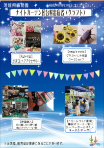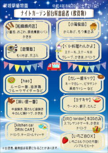 開花情報(花だより) 催し物案内 利用案内 施設案内 茨城県植物園 > 新着情報 > 【イベントより】ナイトガーデン出店者が決まりました! 【イベントより】ナイトガーデン出店者が決まりました!ナイトガーデンの屋台村出店者が決まりました。 テントやケータリングカーの出店とクラフトの販売も行われます。