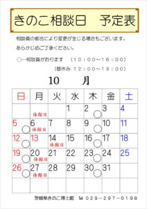 催し物案内 利用案内 施設案内 開花情報(花だより) 新着情報 茨城県植物園 > 新着情報 > 令和7年10月のきのこ相談日予定表をアップしました🍄 令和7年10月のきのこ相談日予定表をアップしました🍄 令和7年10月🍄