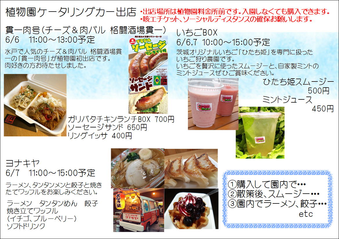 催し物案内 利用案内 施設案内 開花情報(花だより) 新着情報 茨城県植物園 > 新着情報 > ケータリングカー出店(6月6日,7日) ケータリングカー出店(6月6日,7日)今週末も、植物園料金所前にケータリングカーが出店します。 植物園に入園しなくても、購入いただけます。ぜひ、お立ち寄りください。 ※咳エチケット、ソーシャルディスタンスの確保をお願いします。