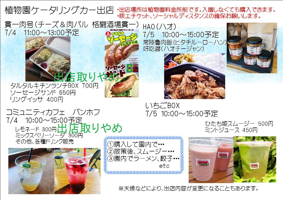 催し物案内 利用案内 施設案内 開花情報(花だより) 新着情報 茨城県植物園 > 新着情報 > ケータリングカー出店取りやめ(7月4日) ケータリングカー出店取りやめ(7月4日)本日のケータリングカー出店は天候不良のため、出店取りやめとなりました。 現時点で、明日は予定どおり出店予定です。