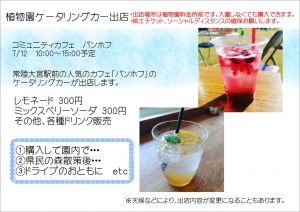 催し物案内 利用案内 施設案内 開花情報(花だより) 新着情報 茨城県植物園 > 新着情報 > ケータリングカー出店(7/12) ケータリングカー出店(7/12)今週末、ケータリングカーの出店があります。 料金所前の出店なので、入園しなくても購入できます。 天候不良により、出店を取りやめにあることもあります。