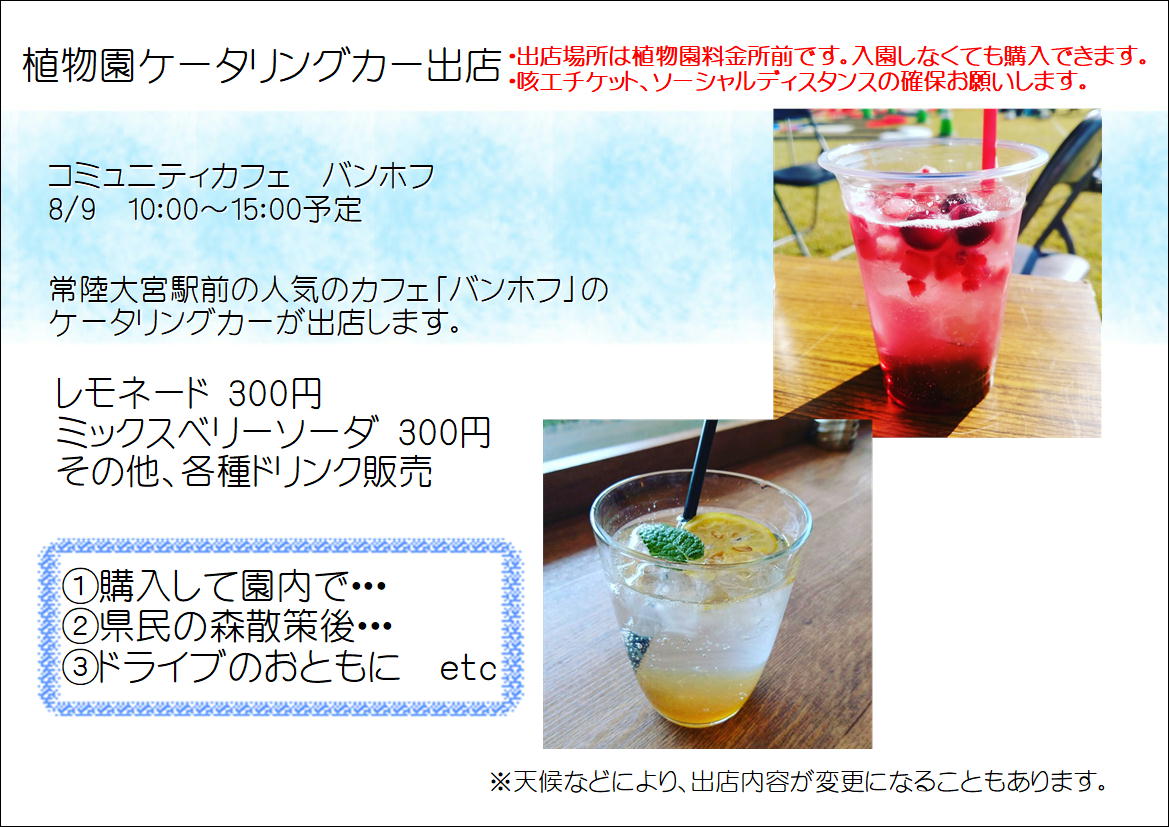 開花情報(花だより) 催し物案内 利用案内 施設案内 茨城県植物園 > 新着情報 > ケータリングカー出店(8/9) ケータリングカー出店(8/9)明日8月9日(日)、ケータリングカーの出店があります。 料金所前の出店なので、入園しなくても購入できます。 天候不良により、出店を取りやめにあることもあります。