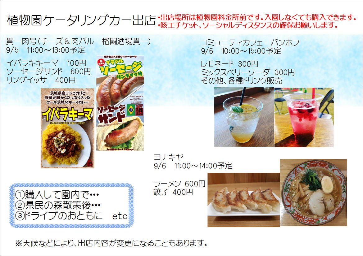 催し物案内 利用案内 施設案内 開花情報(花だより) 新着情報 茨城県植物園 > 新着情報 > ケータリングカー出店(9/5,6) ケータリングカー出店(9/5,6)今週末、ケータリングカーの出店があります。 料金所前の出店なので、入園しなくても購入できます。 天候不良により、出店を取りやめにあることもあります。 貫一肉号(チーズ&肉バル 格闘酒場貫一) 9月5日(土) 11:00~13:00予定 キーマカレー、ソーセージサンド、リングイッサ販売 コミュニティカフェ バンホフ 9月6日(日) 10:00~15:00予定 レモネード、ミックスベリーソーダなど販売 ヨナキヤ 9月6日(日) 11:00~14:00予定 ラーメン、餃子など販売