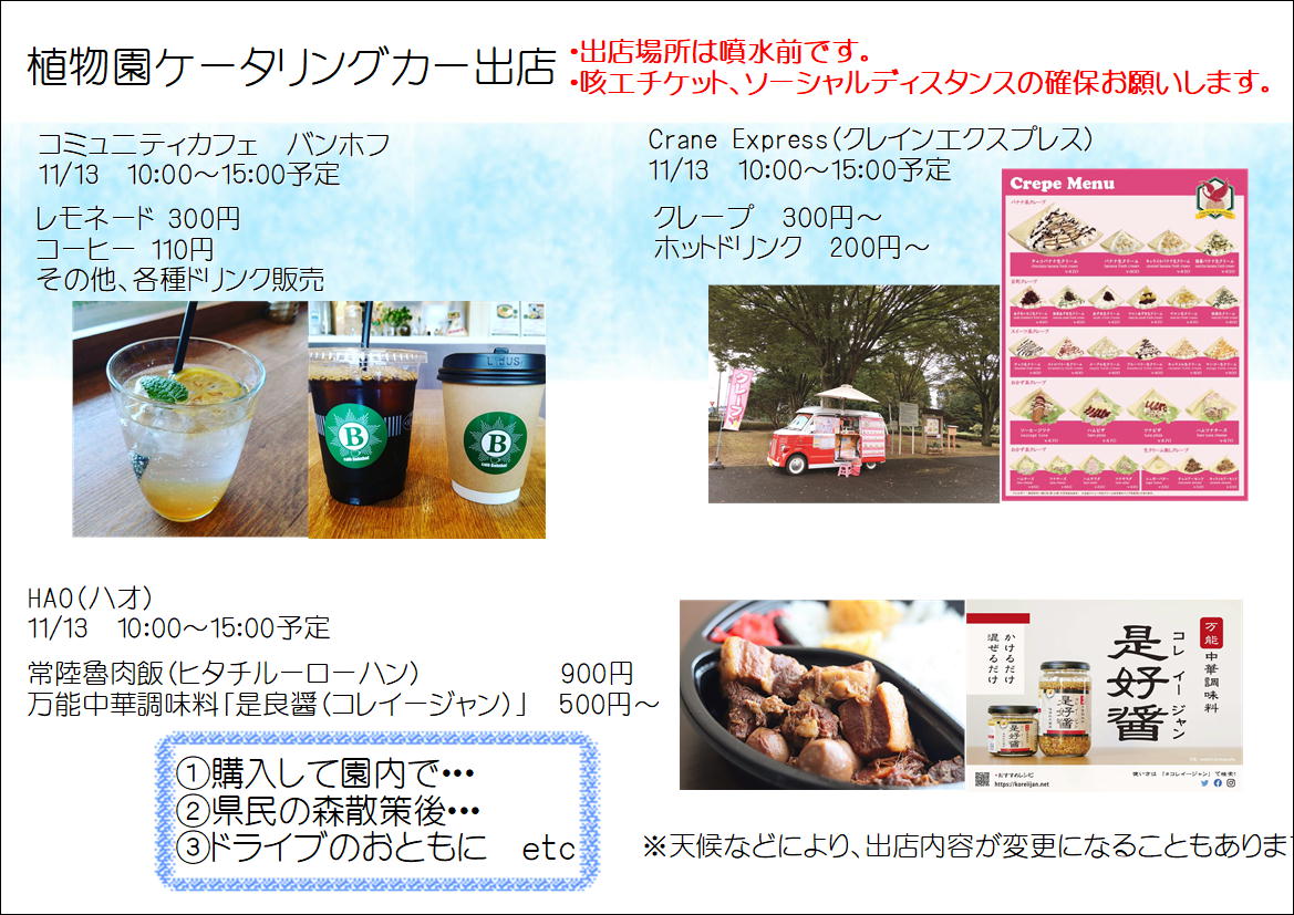 催し物案内 利用案内 施設案内 開花情報(花だより) 新着情報 茨城県植物園 > 新着情報 > ケータリングカー出店(11/13) ケータリングカー出店(11/13)11月13日(金)に、ケータリングカーの出店があります。噴水前の出店になります。 天候不良により、出店を取りやめにあることもあります。 11月13日(金) 県民の日(入園無料) 出店者 ・コミュニティカフェ バンホフ ・Crane Express(クレインエクスプレス) ・HAO(ハオ)
